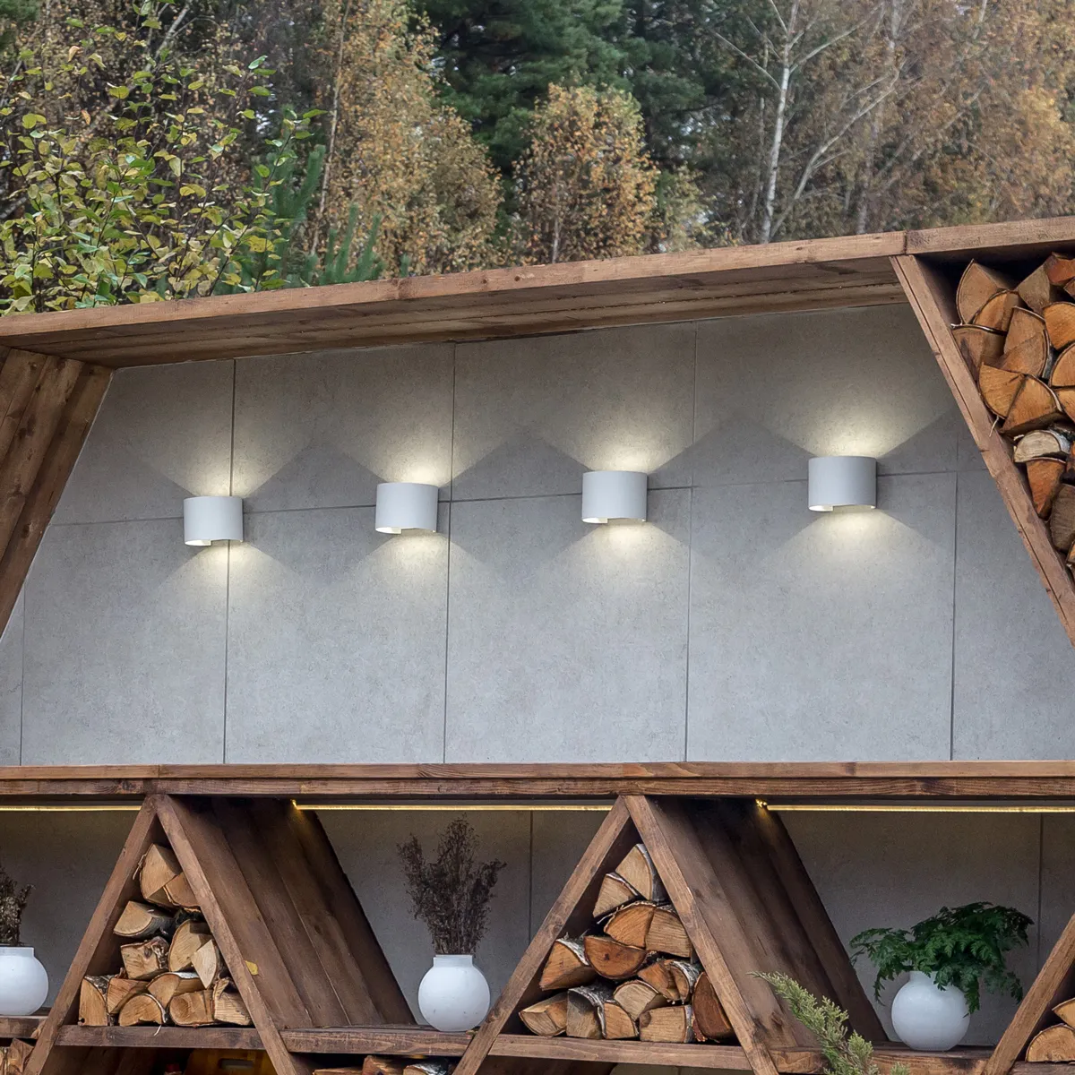 Форма шестигранника стала основой нового дизайна придомовой территории. Обновленный сад получил летнюю кухню с дровницей, зону отдыха с костровой чашей, беседку-«космическую капсулу», лежанку, водоем, качели и огород. Для создания дополнительной декоративной подсветки столешницы в зоне летней кухни дизайнеры использовали светодиодные садово-парковые светильники Blade от Elektrostandard™ .